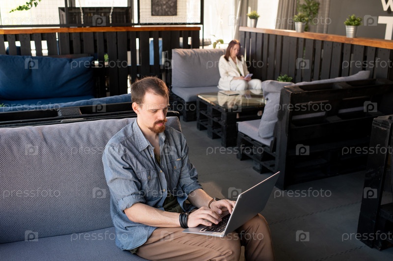 Загруженный молодой человек в повседневной одежде сидит на диване с ноутбуком на коленях