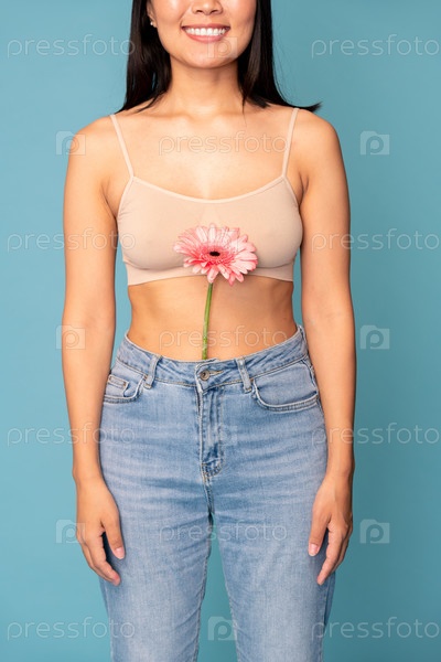 Молодая брюнетка с зубчатой улыбкой и розовой герберой в джинсах