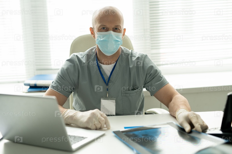лысый зрелый клиницист-мужчина в защитной маске смотрит на вас по месту работы