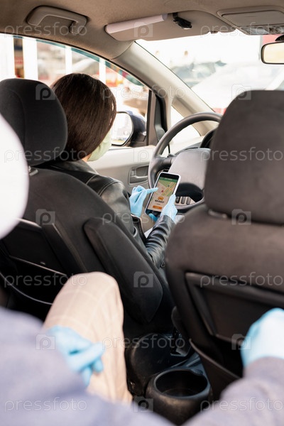 Вид с заднего сиденья водителя такси со смартфоном, который смотрит на карту навигатора