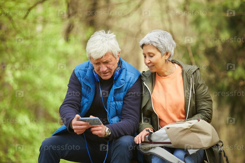 Старшая пара отдыхает во время похода в лес