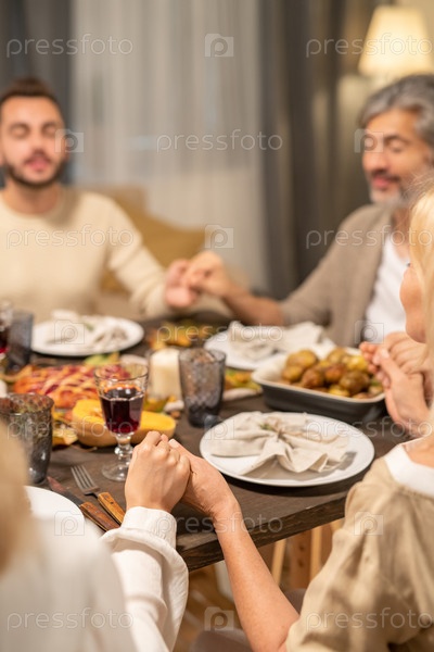 Современная семья из четырех человек, молящаяся на праздничном столе в гостиной
