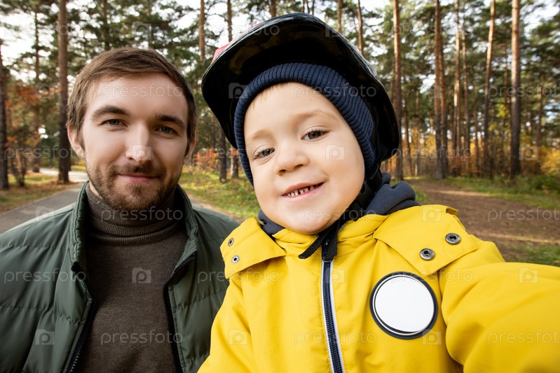Веселый мальчик и его молодой отец в повседневной одежде наслаждаются выходными