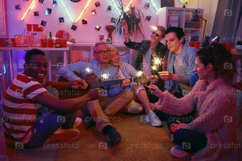 Пожилой мужчина играет на гитаре на вечеринке