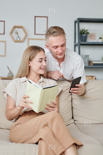 Молодой человек в белой рубашке показывает свою жену с книжной фотографией на смартфоне