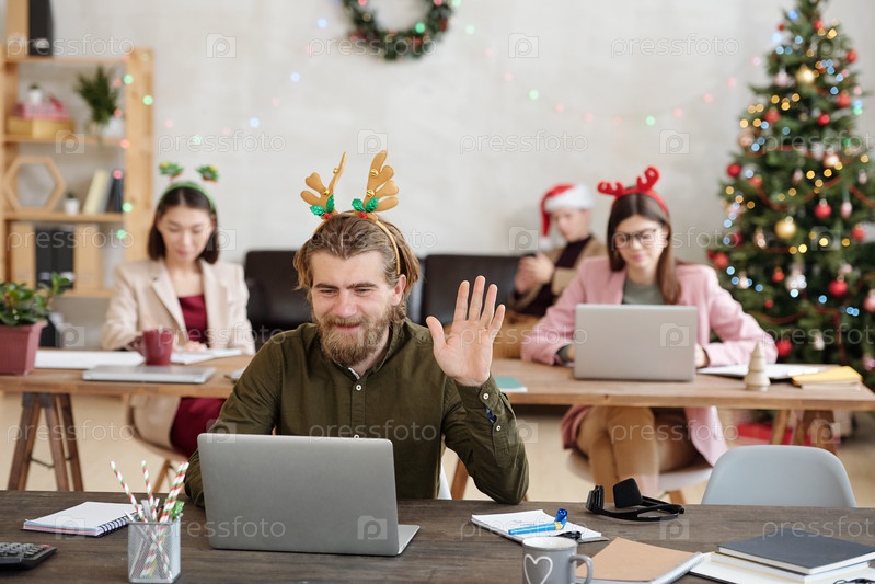 Молодой счастливый бизнесмен смотрит на дисплей ноутбука и машет рукой