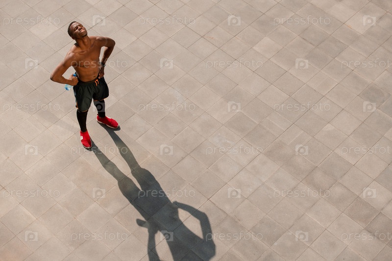 Молодой усталый мужчина без рубашки африканской этнической принадлежности, стоящий в городской среде