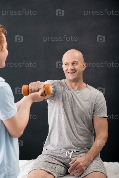 Молодой физиотерапевт помогает взрослому пациенту мужского пола заниматься спортом в клиниках
