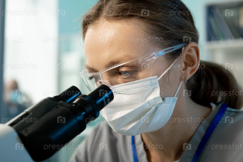 Молодая женщина-ученый смотрит на химические или биологические образцы в микроскопе