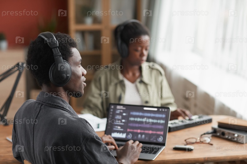 Афроамериканский мужчина редактирует музыку в студии