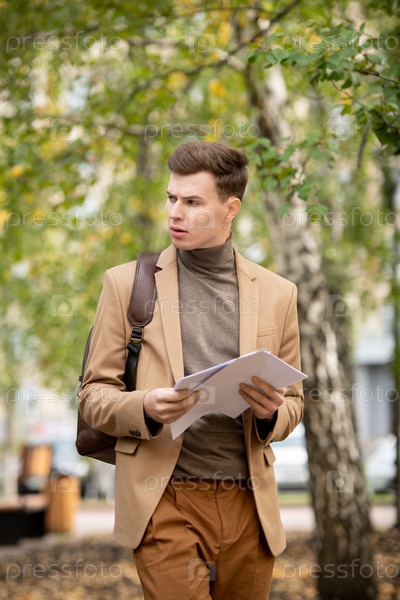 Молодой элегантный бизнесмен или студент в умной повседневной одежде, смотрящий в сторону