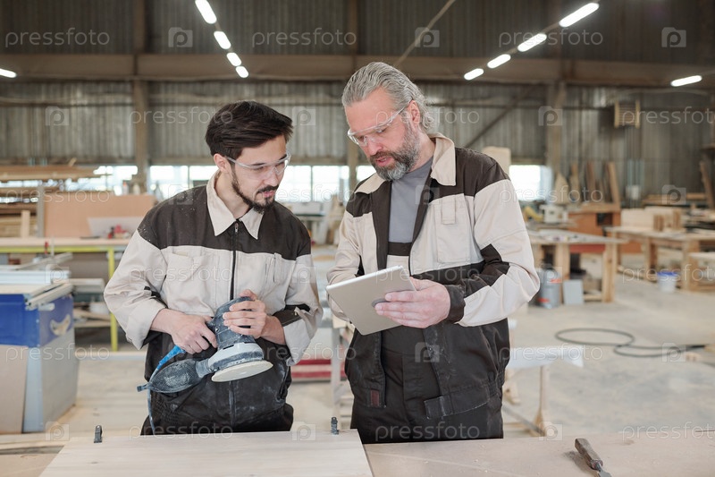 Молодой стажер в защитных очках шлифовывает поверхность деревянной заготовки