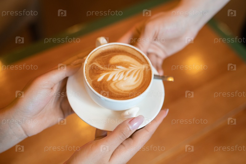 Руки официантки, передающей чашку свежего капучино клиентке-женщине за столом