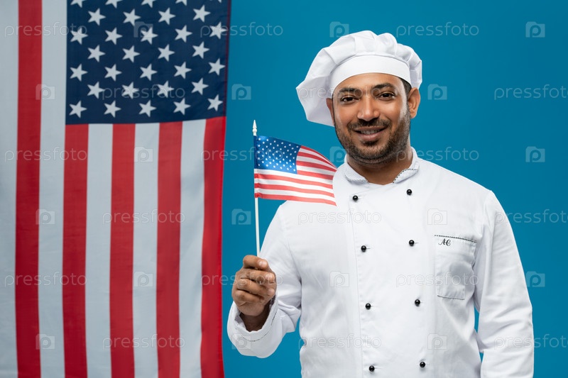 Счастливый молодой шеф-повар в форме держит наш флаг, стоя перед камерой