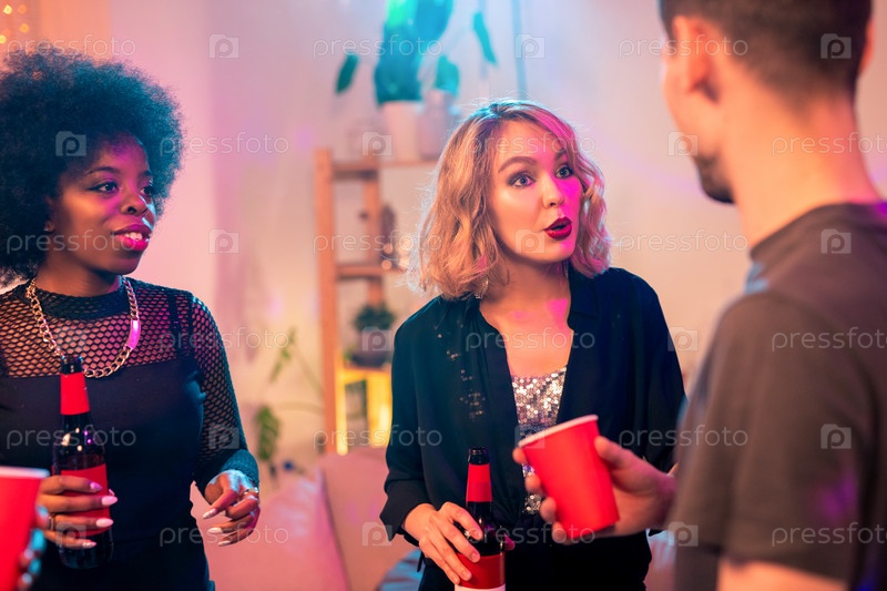 Молодая красивая блондинка с бутылкой пива, разговаривающая со своим парнем на вечеринке