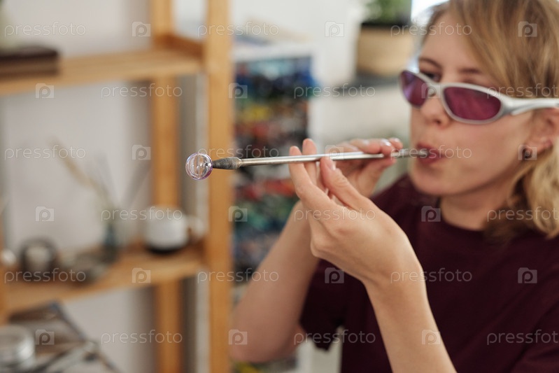 Руки ремесленника в повседневной одежде и защитных очках дуют в длинную трубку