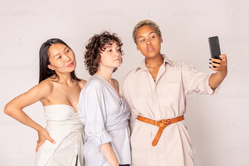 Молодые азиаты, африканцы и женщины в умной повседневной одежде делают селфи