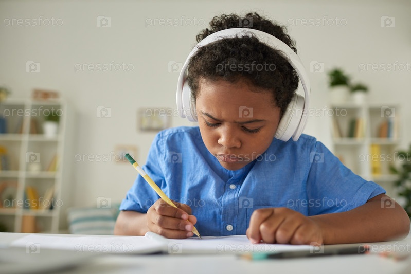 Нахмурившись, сконцентрированный афроамериканский мальчик сидит за столом и думает о решении задачи во время записи записей дома
