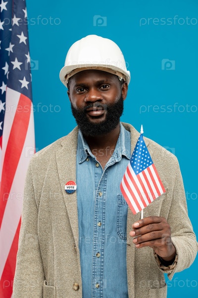 Молодой африканский строитель или инженер в шлеме и формальной одежде, держащий маленький флаг США