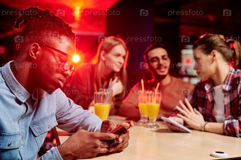 Африканский парень прокручивает свой смартфон, сидя за столом в кафе с друзьями
