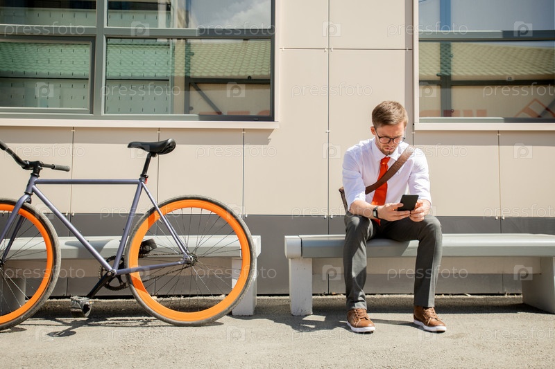 Элегантный молодой человек отправляет сообщения на смартфоне, сидя на скамейке снаружи