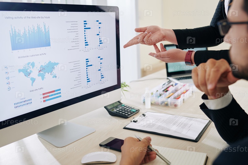 Бизнесмены обсуждают финансовые данные