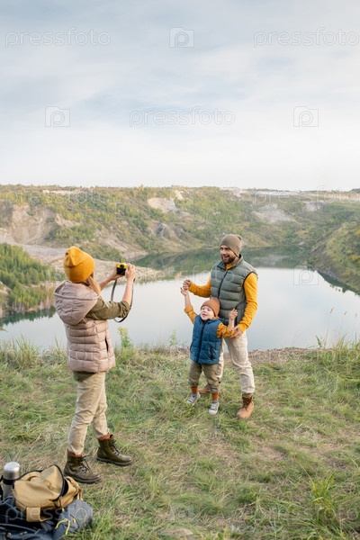 Молодая женщина с фотоаппаратом стоит перед своим мужем и маленьким сыном