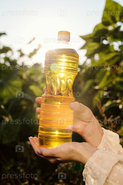 Руки молодой женщины, держащей бутылку подсолнечного масла на зеленых листьях