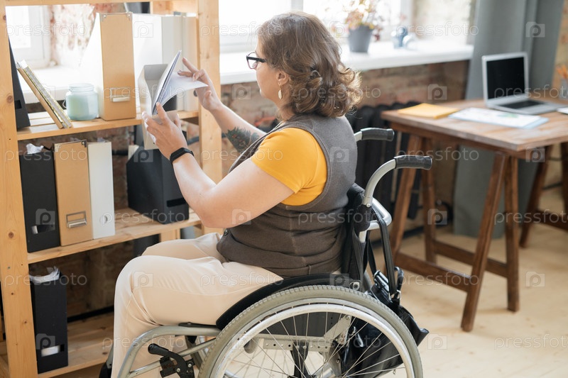 Молодая женщина-официальный работник с инвалидностью в повседневной одежде просматривает бумаги