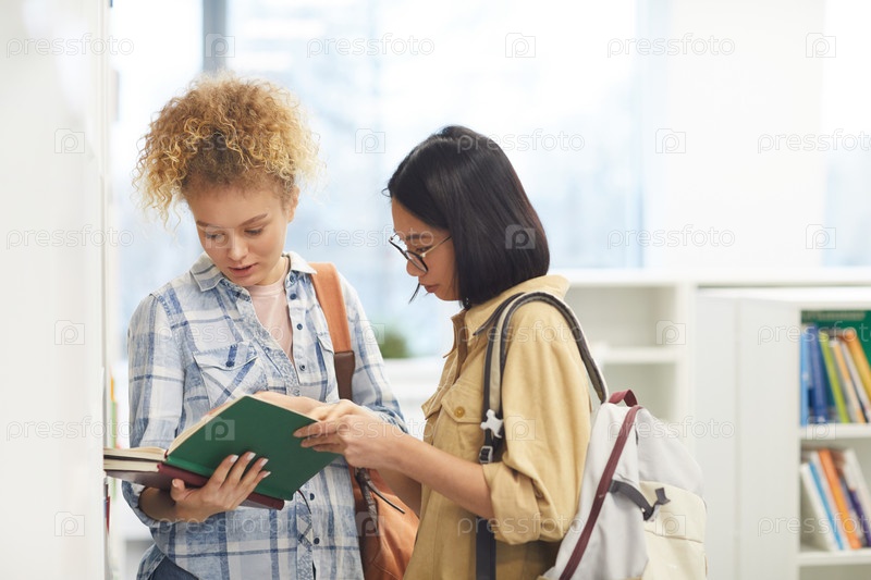 Две девочки читают книгу в библиотеке