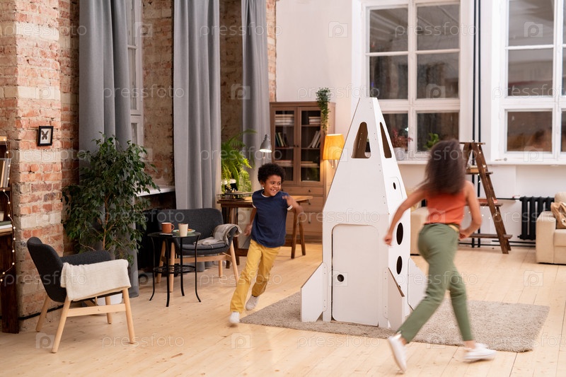 Два радостных брата бегут друг за другом и вокруг большой белой ракеты
