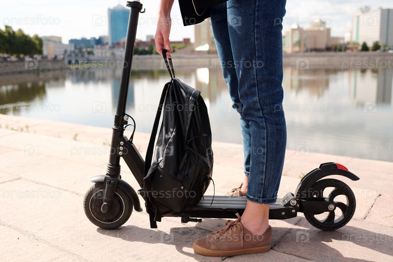 Ноги молодой женщины в синих джинсах, держащей черный кожаный рюкзак над скутером