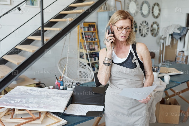 Художник в фартуке смотрит на эскиз
