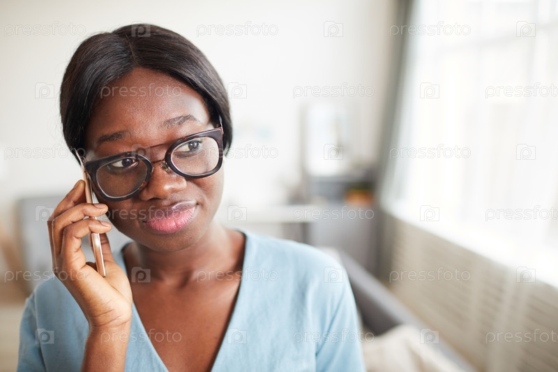 Молодая женщина говорит по смартфону дома