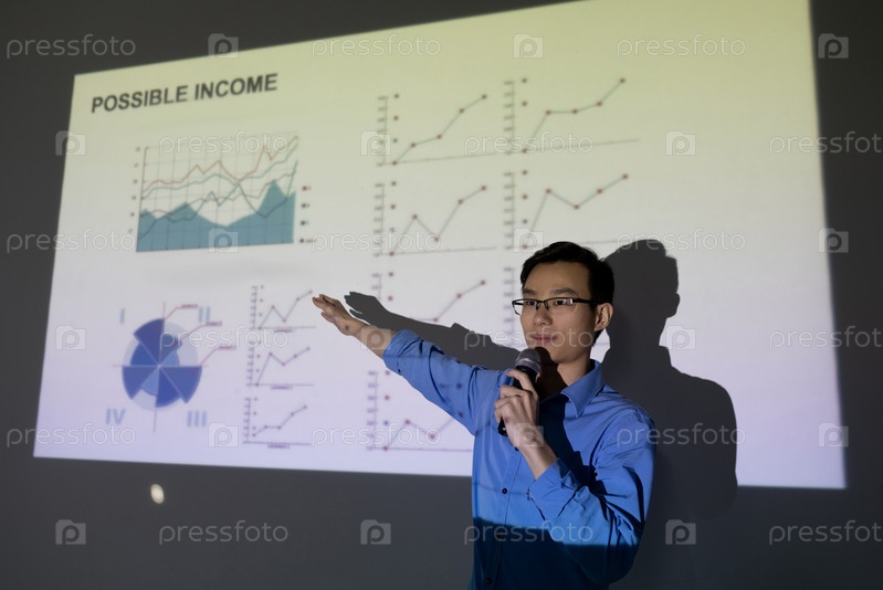 Молодой брокер китайской этнической принадлежности показывает финансовый график на большом экране