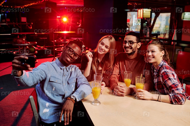 Счастливые друзья в повседневной одежде делают селфи у стола в баре, выпивая