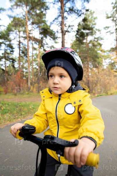 Активный маленький мальчик в обычной куртке и шлеме безопасности катается на своем балансовом велосипеде