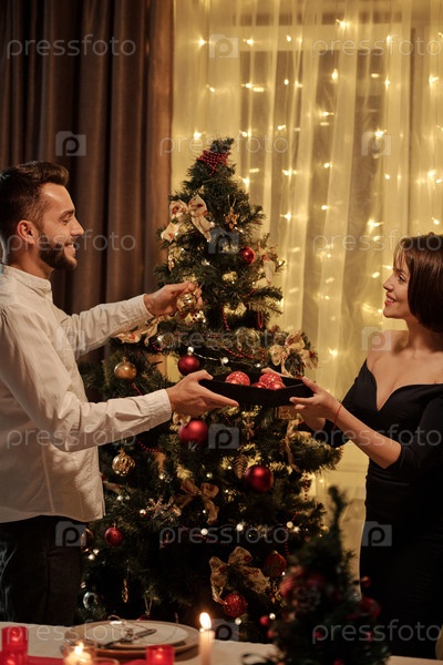 Счастливая молодая брюнетка в элегантном черном платье дарит игровые мячи мужу