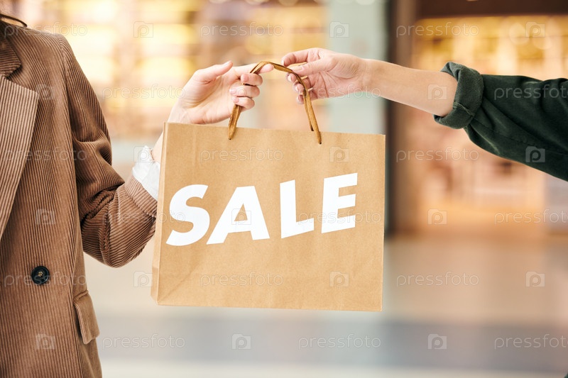 Руки двух молодых современных покупательниц, держащих бумажный пакет