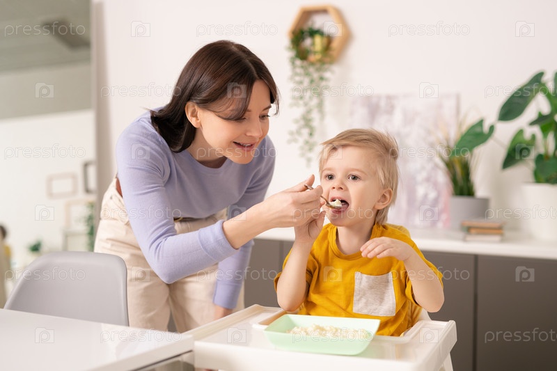 Осторожная молодая женщина в повседневной одежде помогает своему милому маленькому сыну с завтраком
