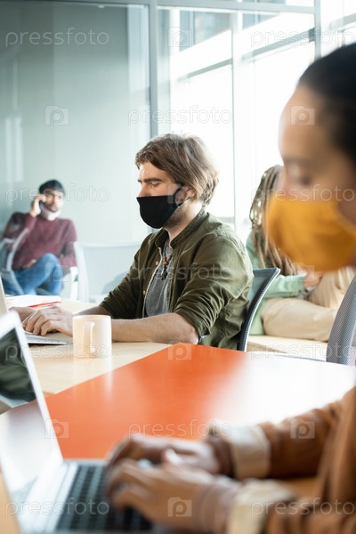 Молодой бизнесмен в защитной маске и повседневной одежде нажимает кнопки клавиатуры