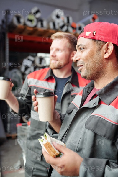 Два счастливых молодых работников склада, которые пьют сэндвичи и кофе в обеденный перерыв