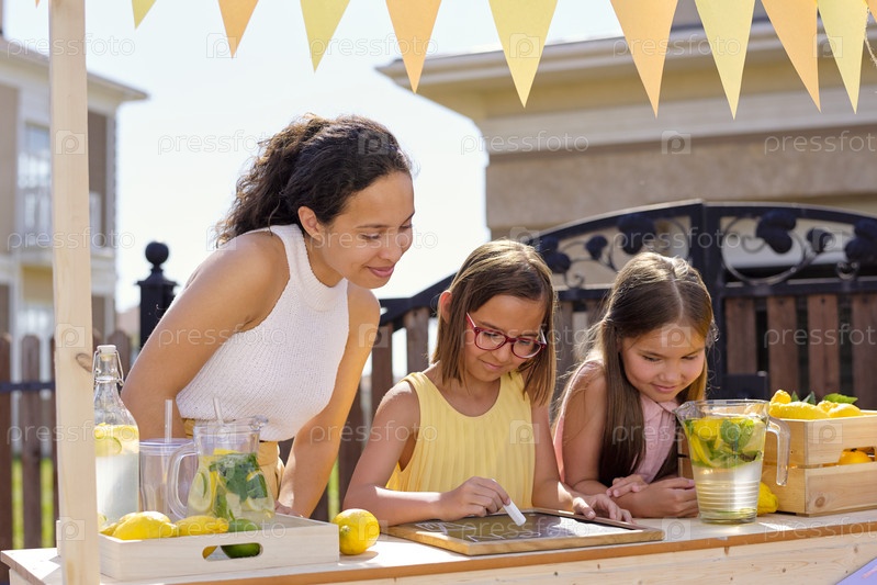 Молодая брюнетка смотрит на свою дочь, указывая на объявление на маленькой доске