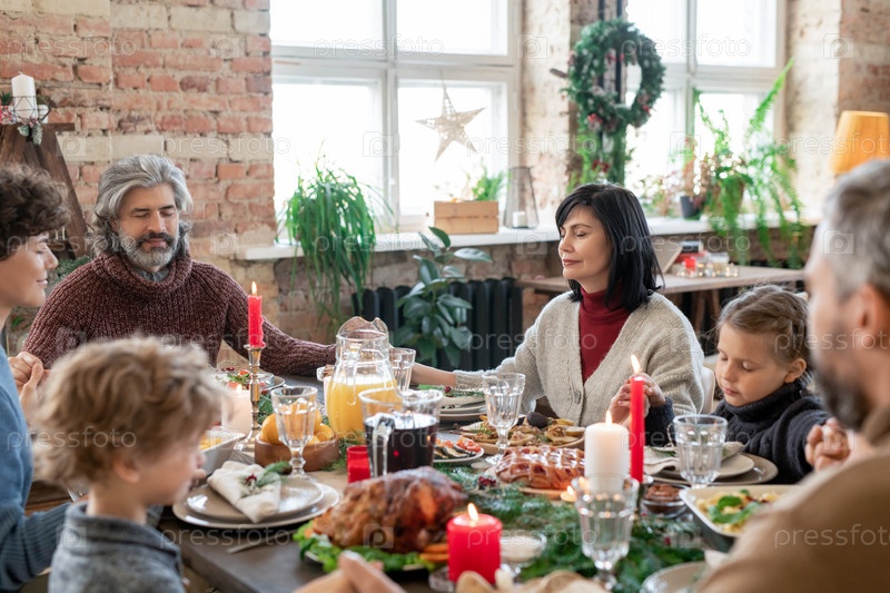 Три поколения большой семьи держатся за руки, молясь перед ужином