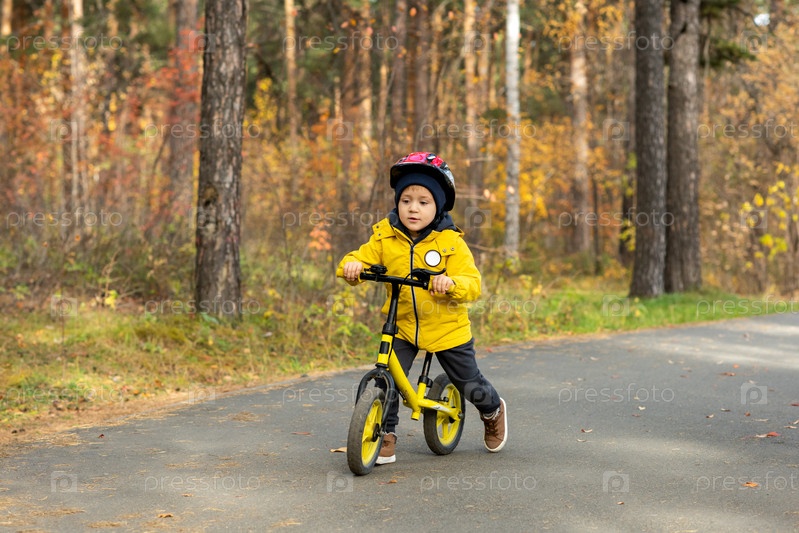 Милый мальчик в желтой куртке и защитном шлеме ездит на велосипеде с балансом