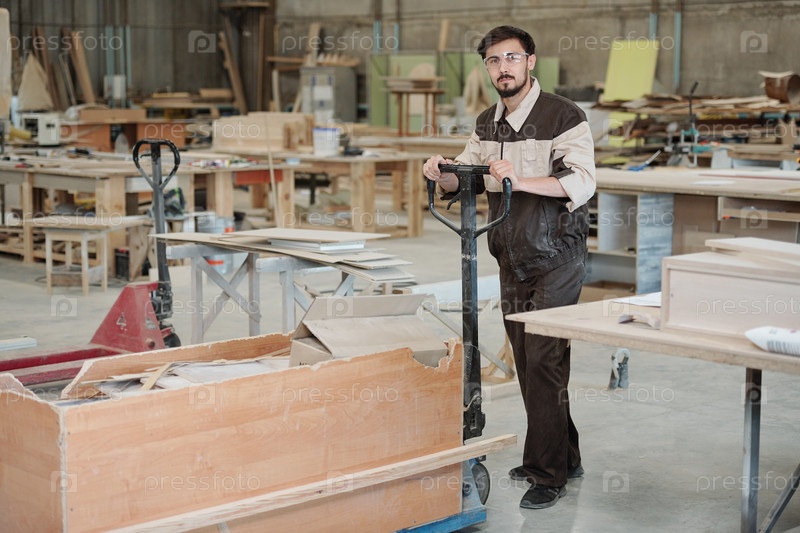 Молодой работник современной фабрики толкает тележку с большой коробкой, полной остатков