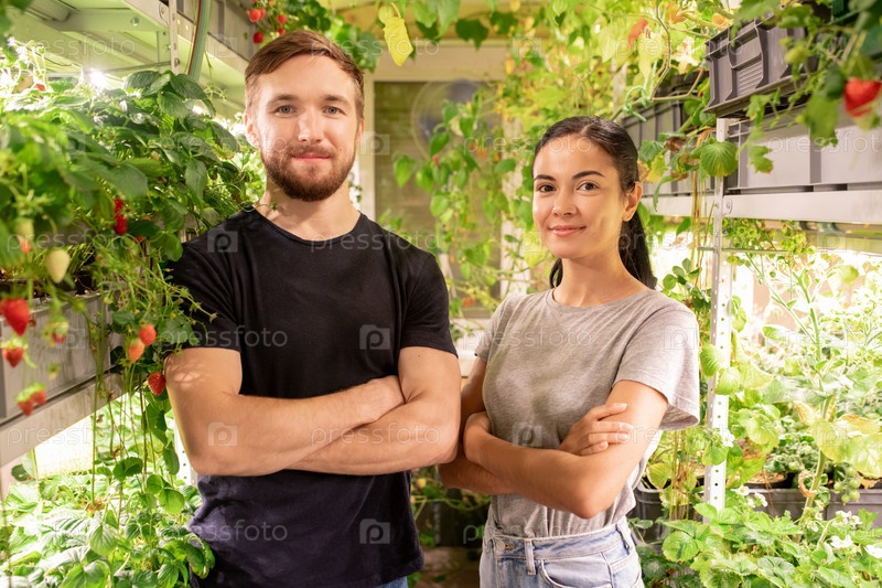 Молодые успешные крестовые фермеры или садоводы, стоящие перед камерой
