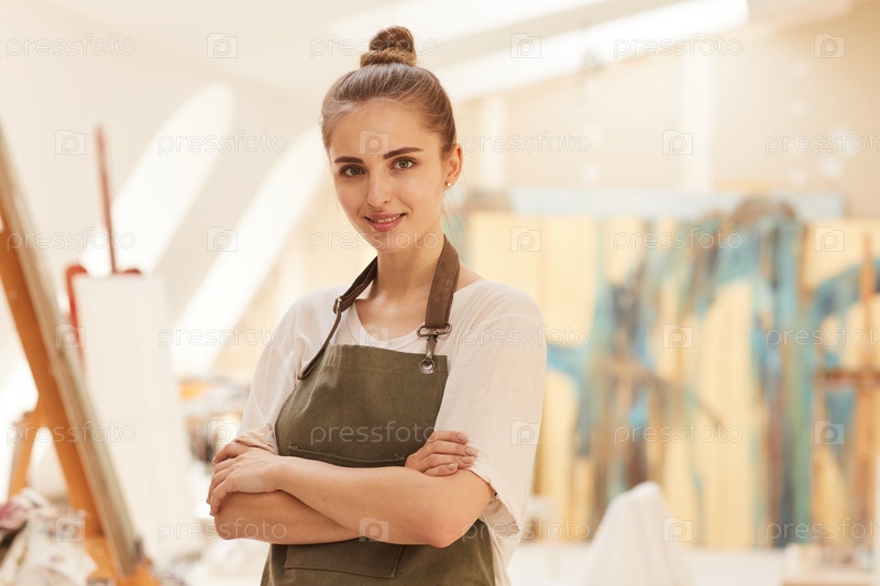 Улыбающаяся артистка позирует в художественной студии