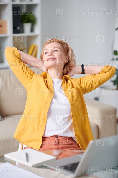 Спокойная зрелая блондинка в повседневной одежде, расслабляющаяся в домашней обстановке