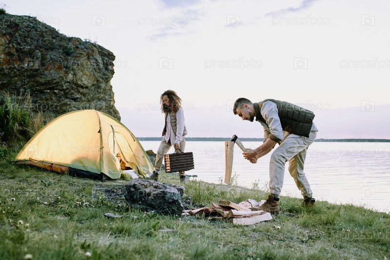 Молодой путешественник-мужчина с топором рубит дрова на берегу реки, покрытой зеленой травой